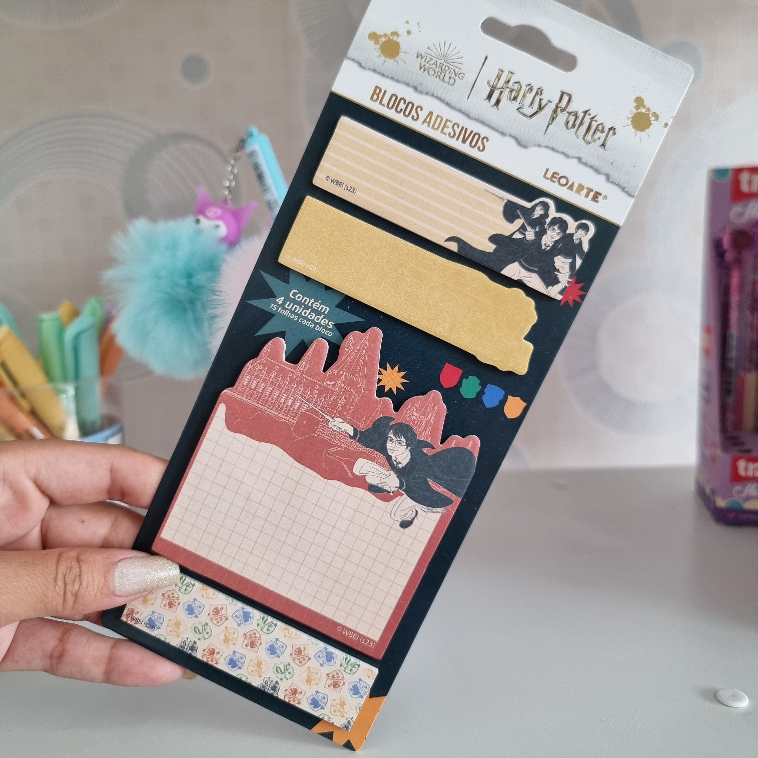 O Bloco Adesivo Harry Potter Leoarte traz 4 blocos inspirados no mundo mágico que conquistou crianças e adultos, cada um contendo 15 folhas. Fabricado com papel e adesivo acrílico, é apresentado em embalagens blister card.
