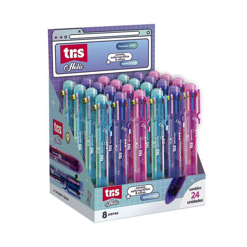 A caneta esferográfica Spectrum possui 8 cores, um clássico da época, e que garante mais praticidade no uso.